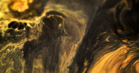 Shiny ink blend. Fluid art. Defocused black yellow golden color metallic sparkling glitter particles acrylic paint pigment emulsion liquid mix flow abstract background.