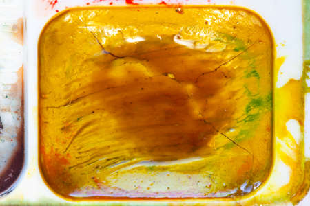divorces and paint drips red, orange, yellow, blue blurred abstract background on a white paper background plane surface close-up macro with filter toning effect