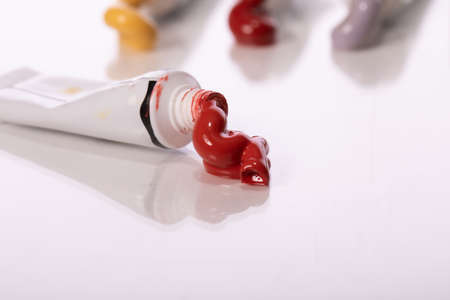 volumetric smear, large drop of red glossy paint squeezed out of tube reflected in glass table surface on background of Colorful paint tubes squeezed on white sheet of glass isolated on white