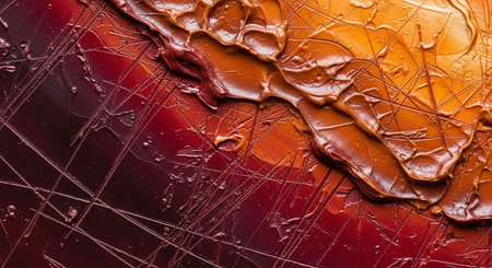 Red metallic glitter paint drips creating abstract patterns and textures, visually representing flow, viscosity, and a modern liquid movement on a light background