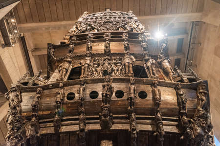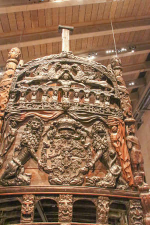 Stockholm, Sweden - November 18, 2018. Transom of 17th century warship Vasa displayed at Vasa Museum (Vasamuseet) in Stockholm.