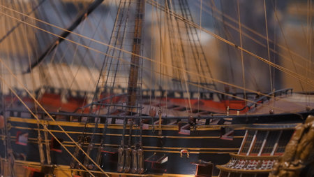 Close-up view of ship models in maritime museum, reflecting ancient sailing vessels..