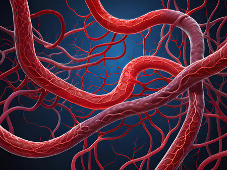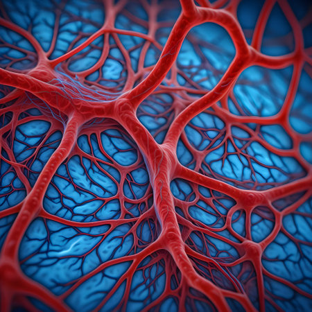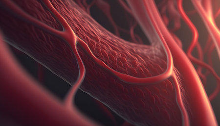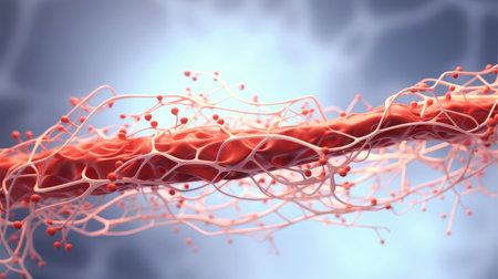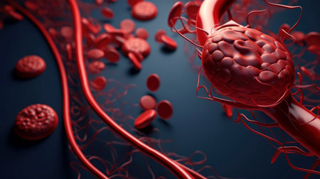 Transparent red blood vessels with glowing particles inside, showing detailed microscopic biological structure in blue background