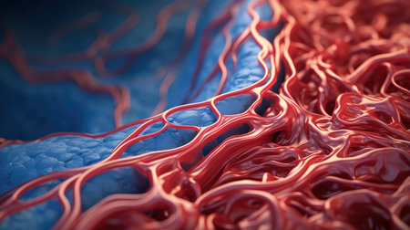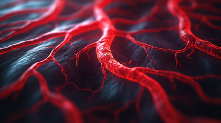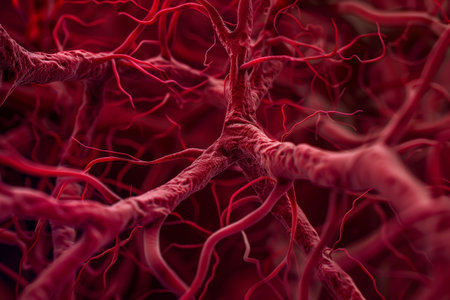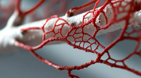 Intricate intertwining of veins and arteries in vivid red color, showcasing the inner workings of the circulatory system, Intricate intertwining of veins and arteries in shades of crimson