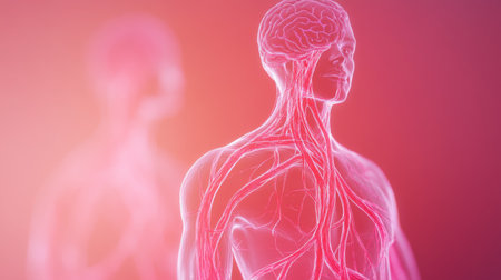 An artistic rendering of the human circulatory system, featuring arteries and veins flowing through the body, against a soft gradient background.