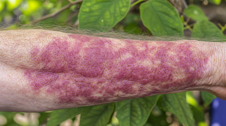 Skin condition with red spots and irritation on arm, indicating possible allergic reaction or dermatitis. texture appears rough and inflamed, suggesting discomfort and sensitivity