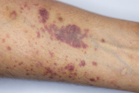 Healthcare worker inspects skin irritation on patient's arm, wearing blue gloves, in a clinical environment, emphasizing the significance of health monitoring and patient care