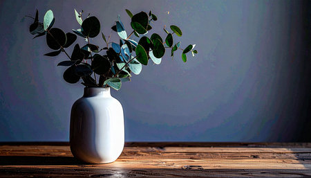 Realistic minimal white ceramic vase holding single green eucalyptus branch, placed on light wooden surface with natural soft light,
