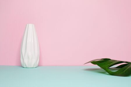 Side view on a still life. Empty white vase and green monstera leaf on a bright pink and mint background.