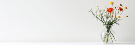 A clear glass vase holds an assortment of wildflowers while bright colors contrast with a neutral backdrop, offering space for text or design.
