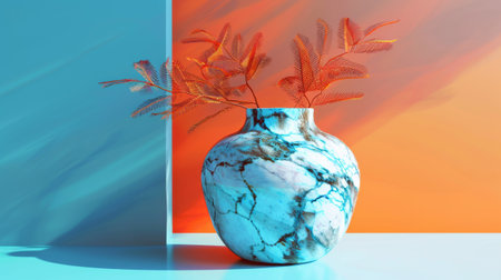 Modern Marbled Vase with Orange Ferns Against Vibrant Blue and Orange Background