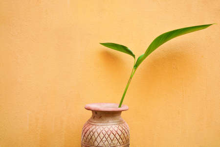 Green leaf in grunge pot, with grunge wall background