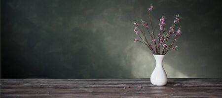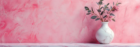 Vase with pink flowers on a pink wall background. Banner.