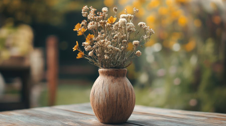 Rustic vases with dried flowers on a wooden, table, creating a warm and cozy ambiance perfect for home decor.