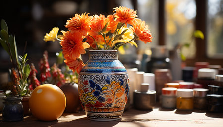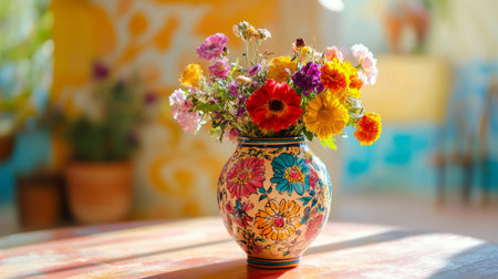 A colorful, hand-painted vase with a traditional design, holding a vibrant bouquet of mixed flowers, set on a bright, sunny table.