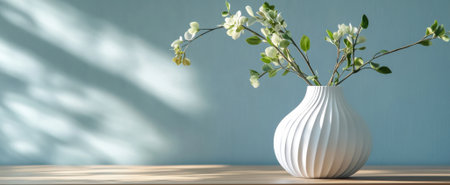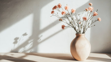 A stunning white vase filled with delicate flowers, set against a soft wall. The natural light creates gentle shadows, bringing a serene and peaceful ambiance to the space.
