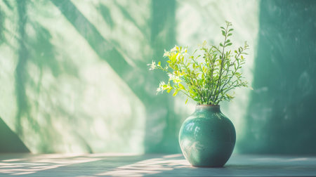 A minimalist green vase with fresh foliage, bathed in soft sunlight, creating a serene and natural indoor setting, symbolizing simplicity and nature.