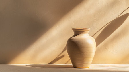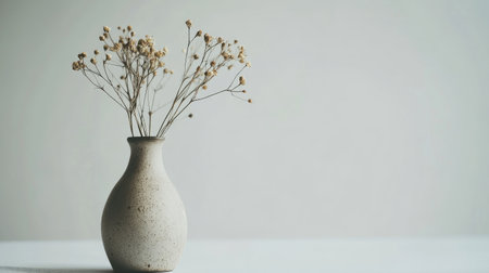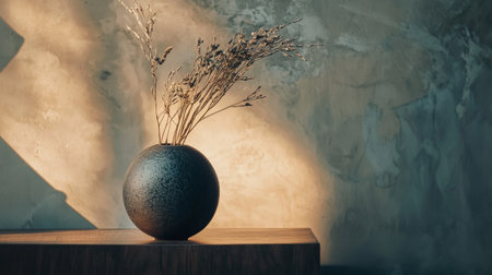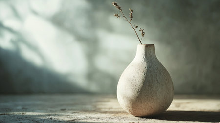 A minimalist image of a dried flower in a textured ceramic vase, casting soft shadows, perfect for tranquil and simple design themes.