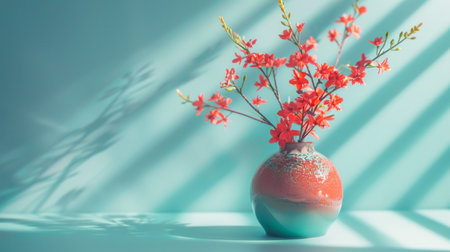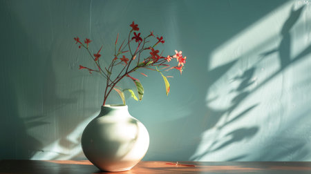 Elegant minimalist scene featuring a vase with red flowers casting soft shadows on a textured teal wall, creating a calm and artistic composition.