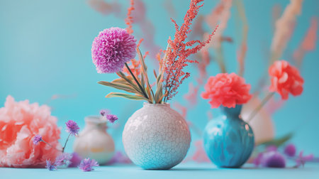 A soft and elegant composition of pastel-colored vases holding a vibrant abstract floral arrangement.
