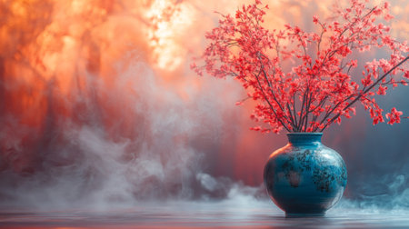 A vibrant blue vase with blooming red branches set against a dramatic smoky backdrop, creating a striking still-life composition.