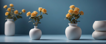 Yellow vase with blooming flowers on blue background. 3d rendering