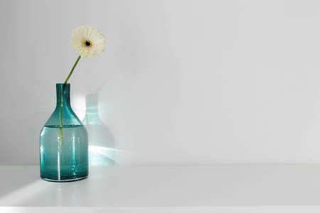 gerber in glass vase on white shelf in sunlight