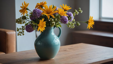 A beautiful teal blue ceramic pot with yellow flowers in it on a wooden surface indoors