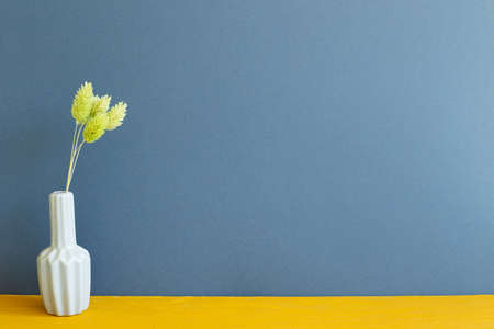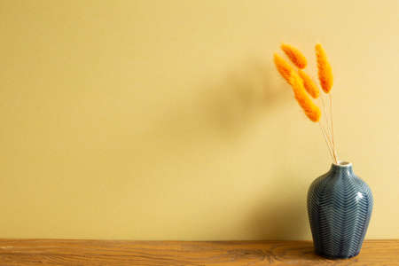 Vase of green dry flowers on yellow wooden table. blue wall background. home interior