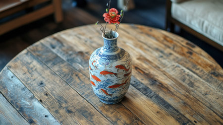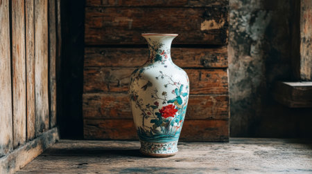 A beautiful porcelain vase featuring floral designs, placed on a rustic wooden surface. This elegant piece adds character to any interior setting.