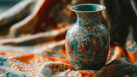 A striking ceramic vase featuring intricate designs displayed on luxurious silk fabric, embodying elegance and cultural artistry, perfect for decor.