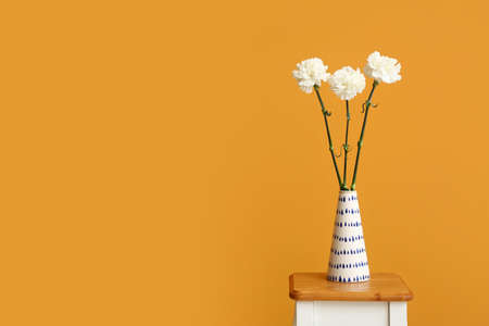 Vase with carnation flowers on table near color wall