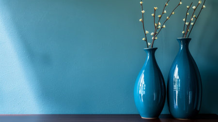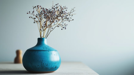 Vase with decorative plant branch against blue wall background. Minimalist interior mockup. Generative AI.