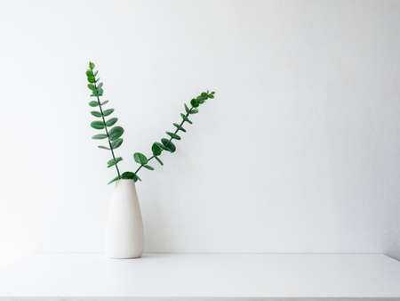 Home interior elegant floral vase decor, soft white composition. Beautiful green leaves branches in white tall vase on white wall background with copy space, minimal style.