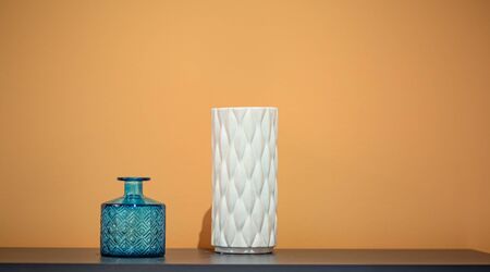 Cozy decor items in the interior, beautiful vases. On a bright orange background, standing on the table .
