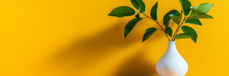Cheerful Indoor Space with Yellow Wall and White Vase Holding Fresh Green Leafy Branches Arrangement