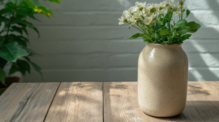 White flowers in a beige ceramic vase on a wooden table