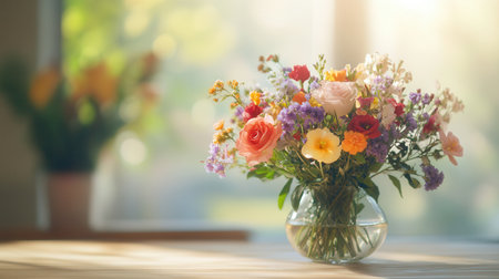 A beautiful arrangement of colorful flowers in a glass vase adds a touch of elegance to a light wood table, creating a serene ambiance.