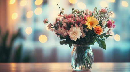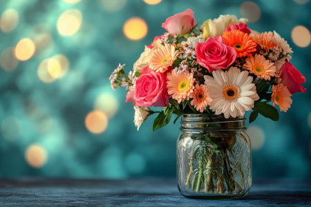 A colorful arrangement of roses, daisies, and wildflowers fills a glass jar. The soft bokeh background creates a dreamy atmosphere, perfect for any floral lover.