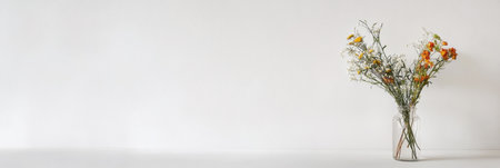 Bright wildflowers arranged in a clear glass vase set against a neutral backdrop, providing a spacious layout for text or design elements.