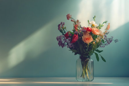 A vibrant bouquet of mixed flowers in a glass vase with a pastel background, ideal for spring, floral, and romantic concepts.