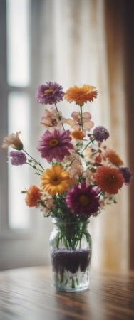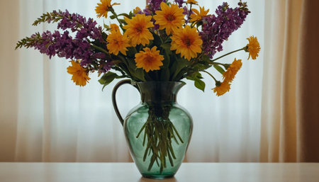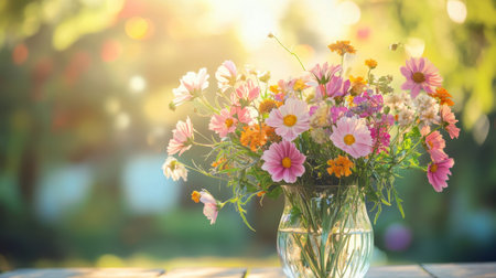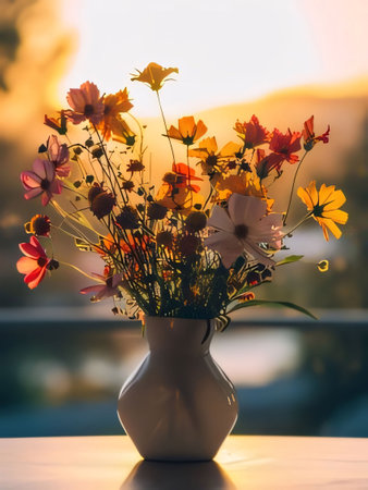 A beautiful arrangement of wildflowers in a vase, illuminated by soft sunlight, creating a warm and inviting atmosphere in a cozy indoor space.