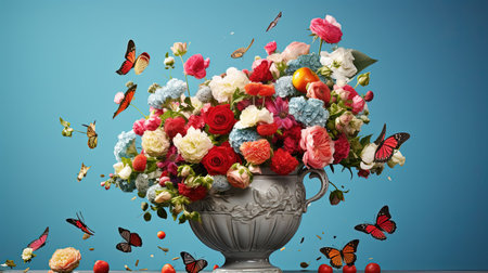 A stunning arrangement of colorful flowers in a decorative pot, set against a fresh turquoise background. Perfect for home d