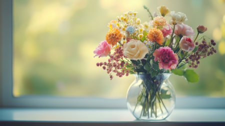 A vibrant vase filled with assorted flowers sits on a windowsill, illuminated by warm sunlight.