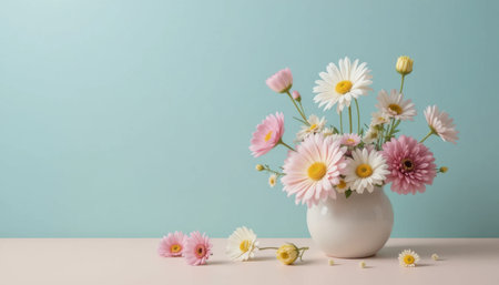 A serene floral arrangement in a white vase against a soft pink wall, featuring pink and white flowers, perfect for home decor.