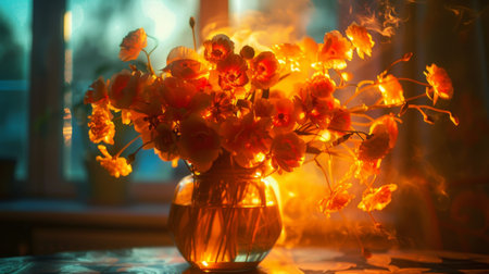 A beautiful bouquet of illuminated fire flowers, radiating warmth and color in a dimly lit room
