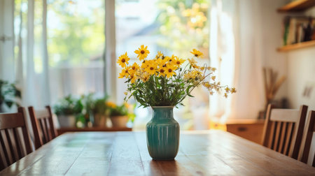 Natural-light-filled dining space with neutral palette, wooden furniture, and a refreshing splash of yellow flowers in a jade-colored vase