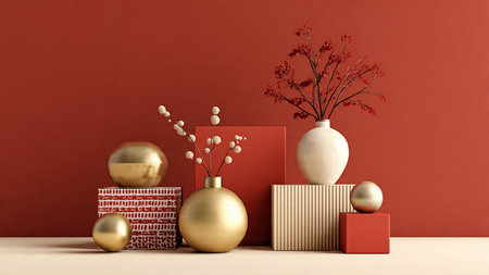 Warm classic Christmas frame involving shiny gold stars, red ornaments, and perfect gift packages.