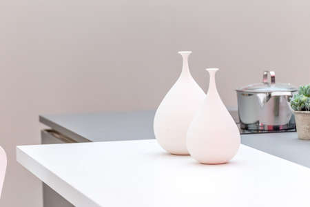 3D rendering, Home decor white ceramics vases and pot on grey background with copy space, 3D illustration