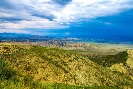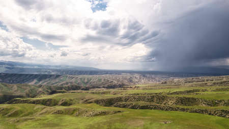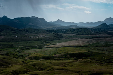 Incredibly beautiful landscape view from the mountain of Klimentyev, Crimea, to the valley before a thunderstorm in spring.